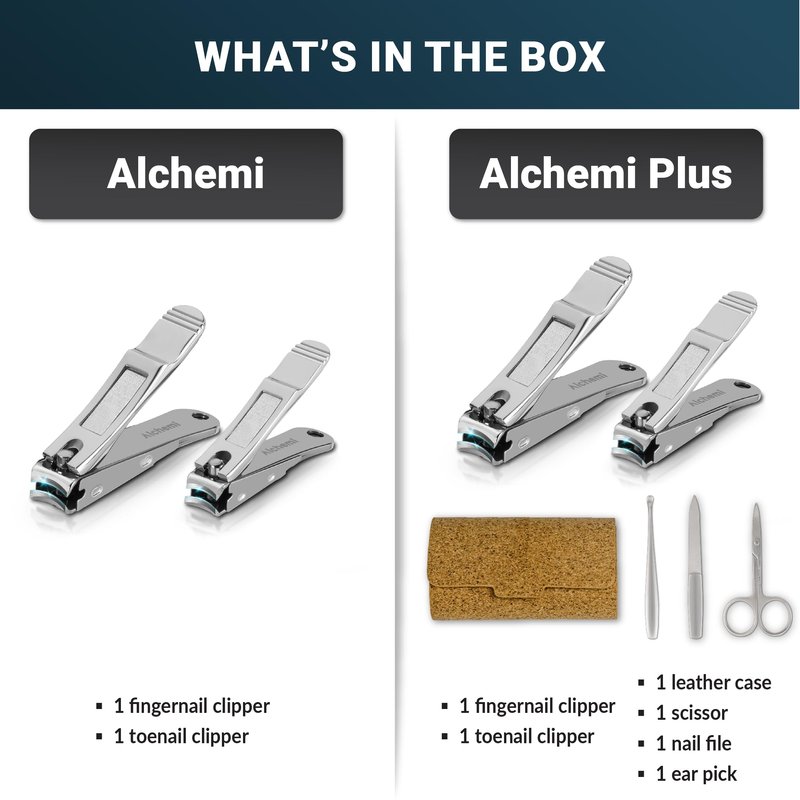 - What's in the Box: The Alchemi set includes 1 fingernail clipper, 1 toenail clipper, and 1 beautiful box. The Alchemi Plus set includes 1 fingernail clipper, 1 toenail clipper, 1 leather case, 1 scissor, 1 nail file, 1 ear pick, and 1 beautiful box.