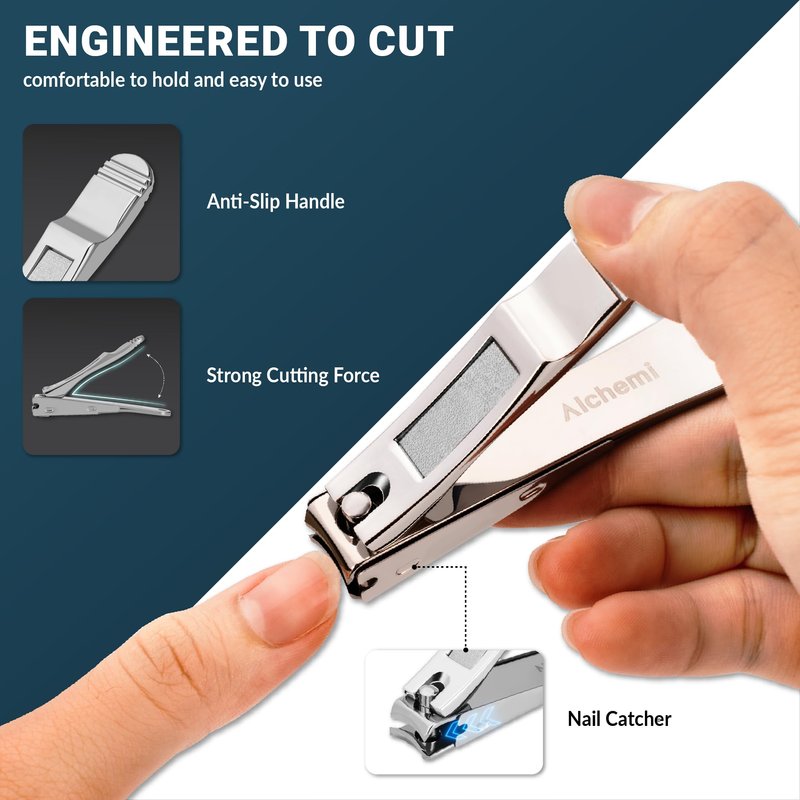 - Mess Free Nail Clipper: Alchemi's nail clipper features a robust body for stability, ergonomic design for a comfortable grip, and a built-in nail catcher for mess-free trimming, ensuring confident and tidy results.