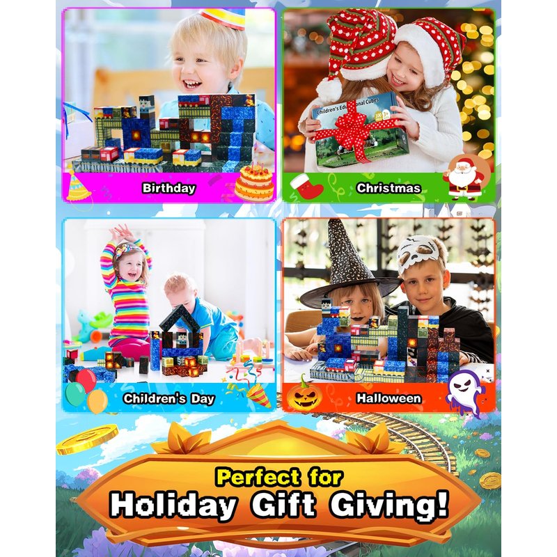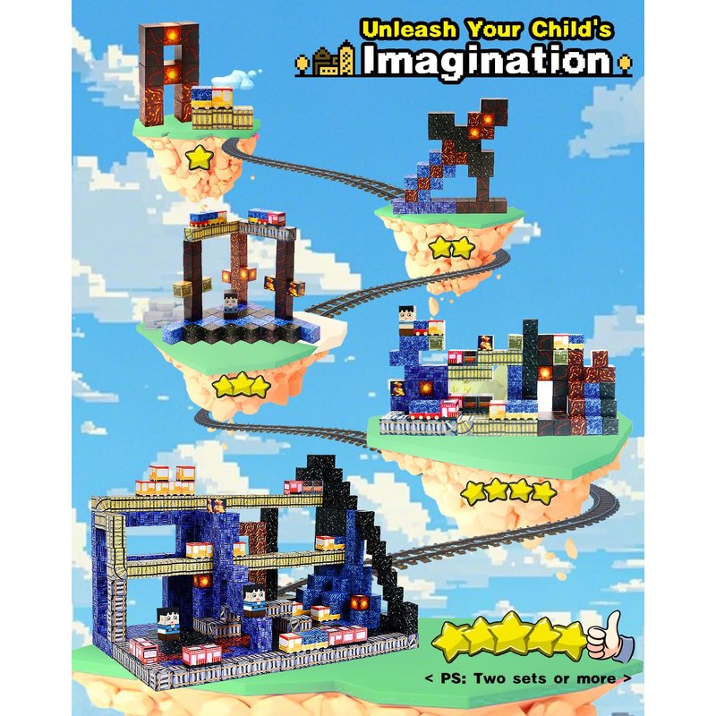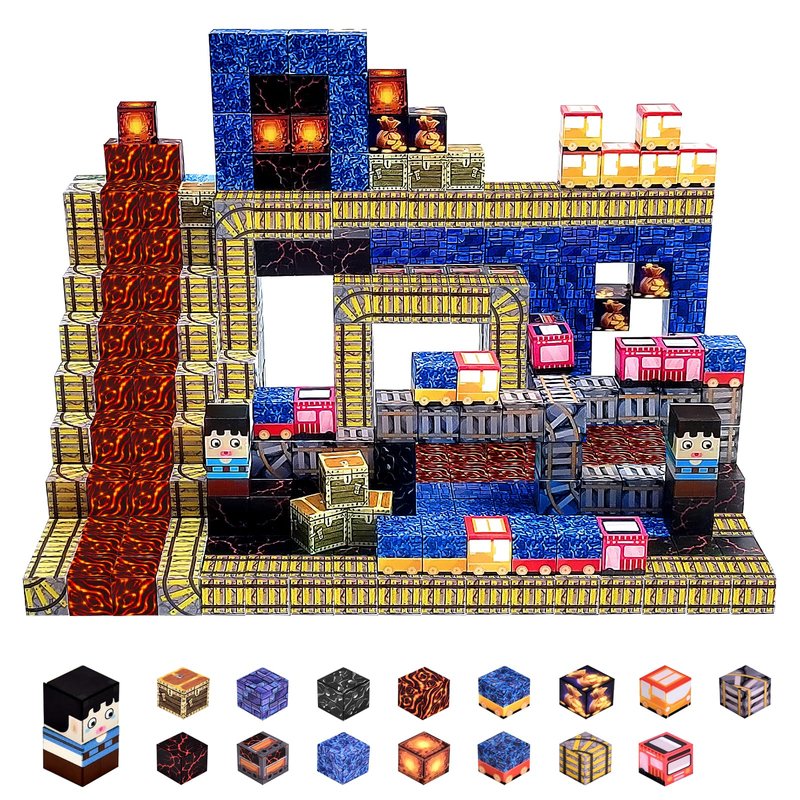 - 【Build A World of Train Transportation Treasure Hunt】This 100-piece magnetic building block set contains many different elements, including lava, ore, tracks, trains, treasure chests, and more. The track blocks have various directions, including straight roads and multi-directional curves, allowing children to use their creativity and imagination to build complex underground tracks and start exciting treasure hunts. Building toys for kids ages 3-12 cultivate children's creative thinking, concentration and patience