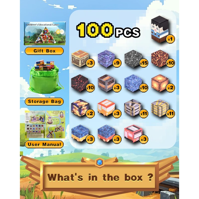 100-Piece Creative Magnetic Building Blocks Set --- Includes 100*Children's Magnetic Building Blocks 1*Storage Bag, 1*Creative Reference Sheet, 1*Exquisite Packaging Box. Our newly designed magnetic building blocks have more elements to provide children with more creative possibilities and let them experience the most popular building games. Popular magnetic building block toys for boys, kids, toddlers and girls aged 3 4 5 6 7 8 9 10 11 12+