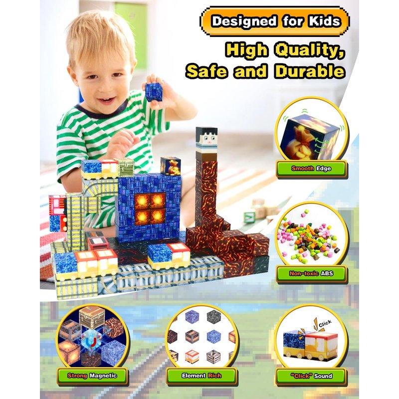 - 【Safe and Durable Kids Toys】The magnetic blocks are made of high-quality non-toxic materials, with smooth and rounded edges and a suitable size that will not hurt your baby's little hands, ensuring your child's safe play. Individual magnetic blocks are 0.8inch in size and should be played by children under 3 years old under parental supervision to prevent accidents such as swallowing. Magnetic building toy is a fun individual or group activity and a great alternative to screen time