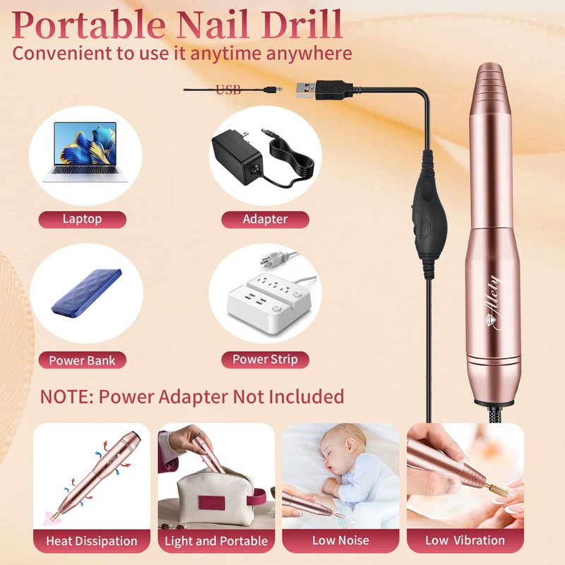 - 【Portable & Easy to Use】This electric nail file is made of high-quality metal, ergonomic and lightweight, more comfortable to hold. With adjustable speed & direction controller for Right or Left hand. You can connect the cord (without adapter) to any USB device to do your nail artwork anytime anywhere.