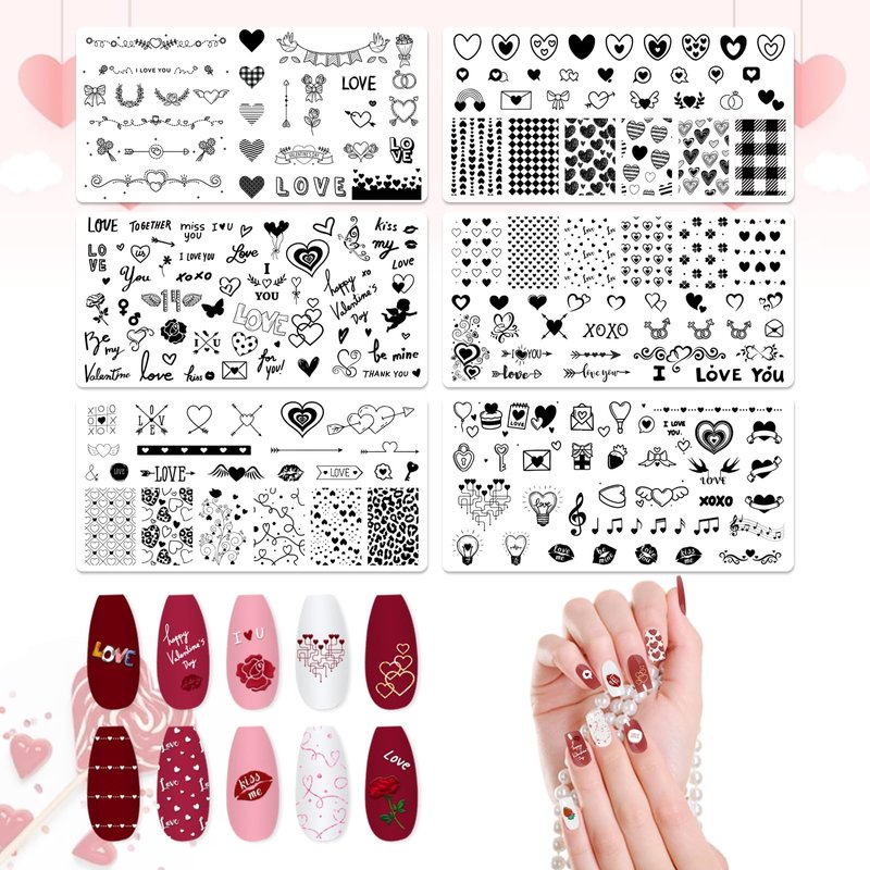 • Package Contains: 6 pieces Valentine's Day nail stamping templates, including heart background, rose flower, bow, ring, love letter, music notes, lips, love words, etc.. Each template contains a lot of sketches and offers you multiple choices to create proper style and make your nail more attractive. Notice: the stamp and scraper are not included.