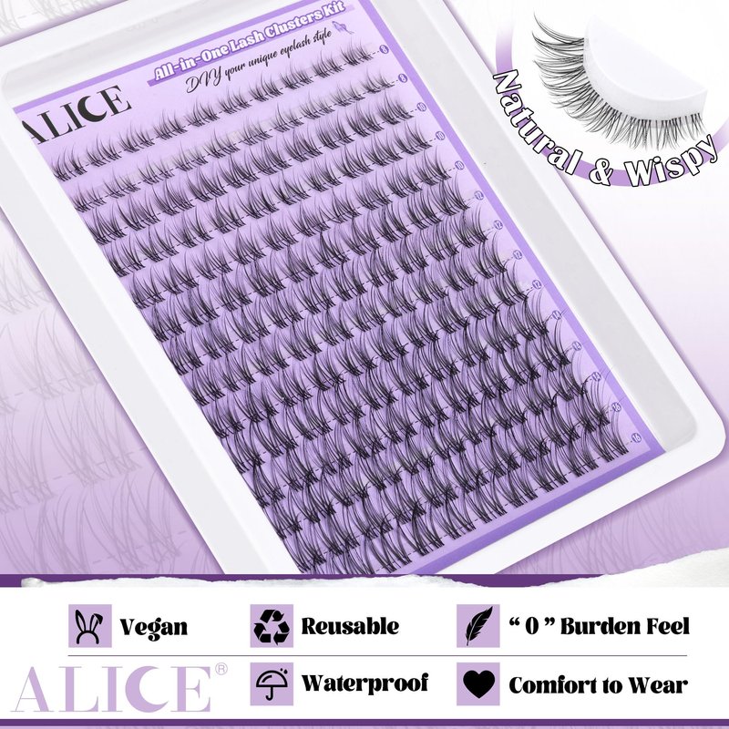 ALICE is committed to providing diverse soft lash clusters for women of all ages and styles.We hope to bring you the most satisfying false lashes and the most enjoyable shopping experience.WHY Choose ALICE:Soft Material & Upgrade Production ProcessReusable & Long-lastingBeginner-friendly & No residueComfortable to apply & No Burden100% VeganChoose ALICE, your Beauty Discoverer & Amplifier!