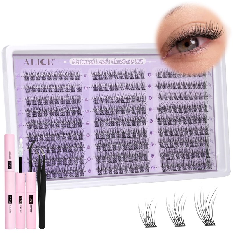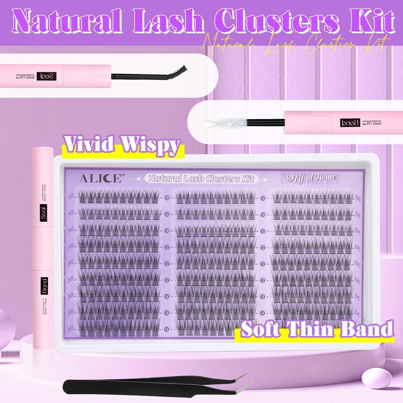 ALICE Natural Lash Clusters Kit Wispy Lash Extension Kit Thin Band Cluster Eyelash Extension Kit 270pcs C Curl 10-14mm Individual Lashes with Lash Glue Bond and Seal Self Application at Home