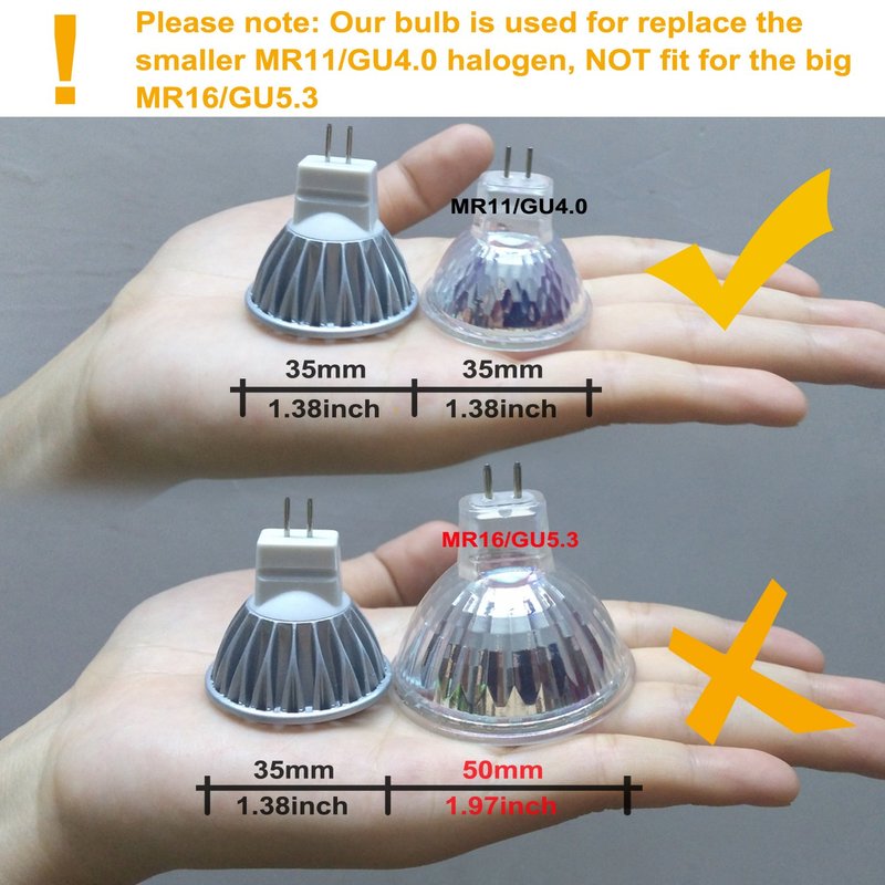 *3. Please don't mix with MR16 bulb(GU5.3, diameter 50mm, 5.3mm between pins), this is MR11(GU4.0, diameter 35mm, pins distance 4mm)