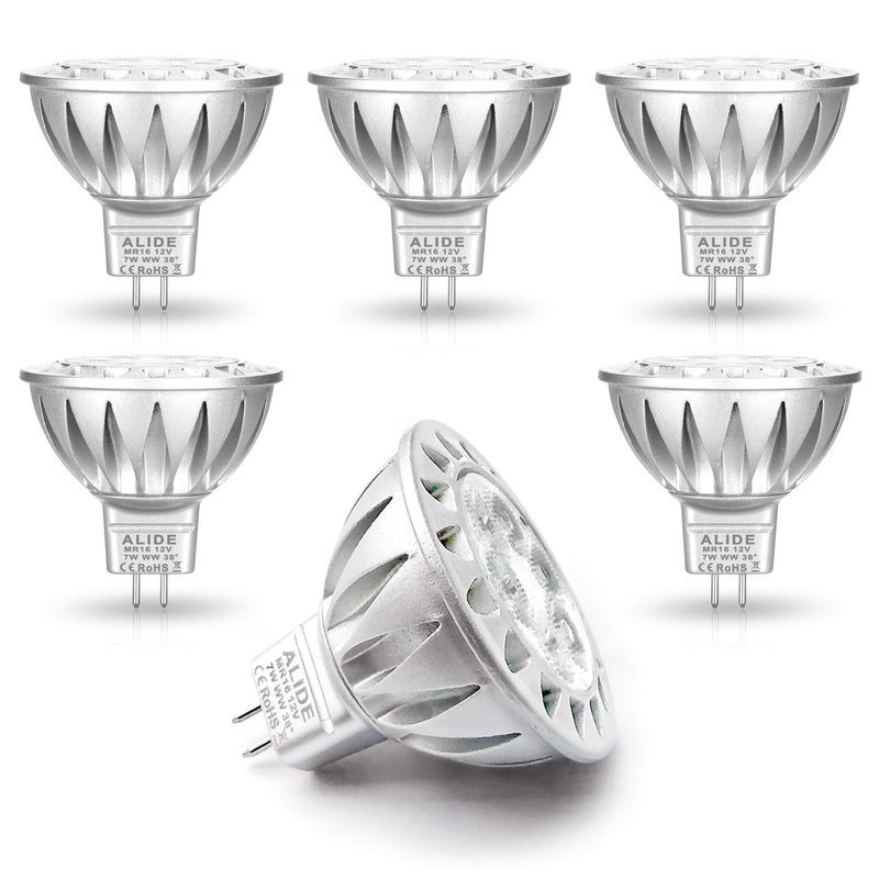 ALIDE MR16 7W GU5.3 Led Bulbs Replace 50W-75W Halogen Equivalent,2700K Warm White,12V Low Voltage MR16 Bulb Spotlight for Outdoor Landscape Flood Track Recessed Lighting,560lm,38 Deg,6 Pack