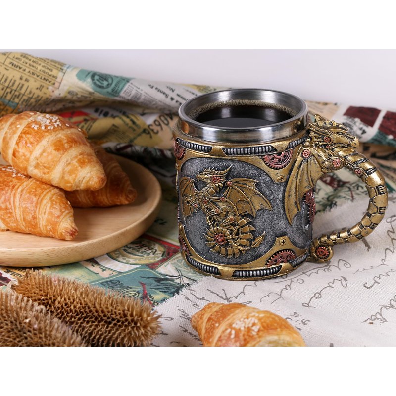 alikiki Medieval Steampunk Dragon Mug - Renaissance Mechanical Dragons Beer Stein Tankard Stainless Coffee Cup Father Day Gift Mug for Dragon Collector Lovers Themed Party Decoration (14OZ)