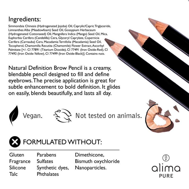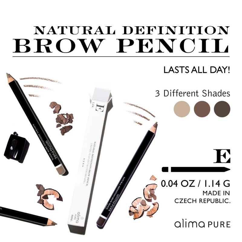 - EYEBROW PENCIL: Natural definition brow pencil is a creamy, blendable eyebrow pencil designed to fill and define eyebrows. Shades: Blonde (for light blonde to light brunette brows), Brunette (for medium to deep brunette brows), Raven (for deep brunette to black brows)