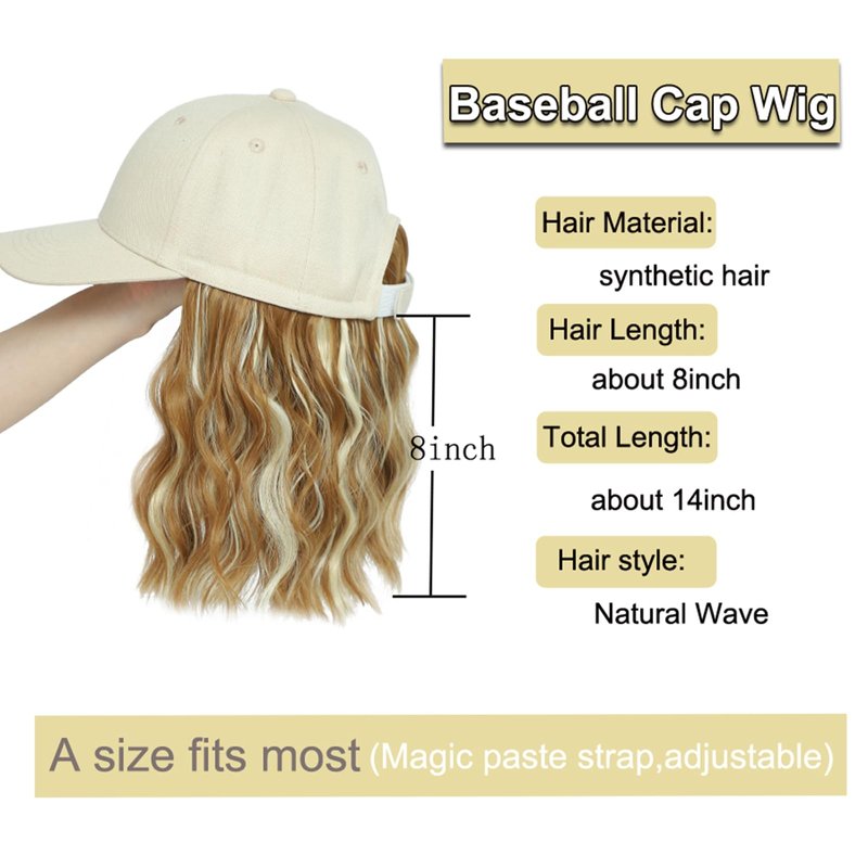 • 2. Adjustable Size Fits Most: Adjustable strap with magic paste, One Size fits Most Head Sizes. The wig is very easy to wear. You just need to tie up your own hair, put the wig on your head, and the adjustable Velcro makes the baseball cap to custom fit your head. A beautiful hairstyle is done within seconds. Wig with hat is more comfortable than full wigs.