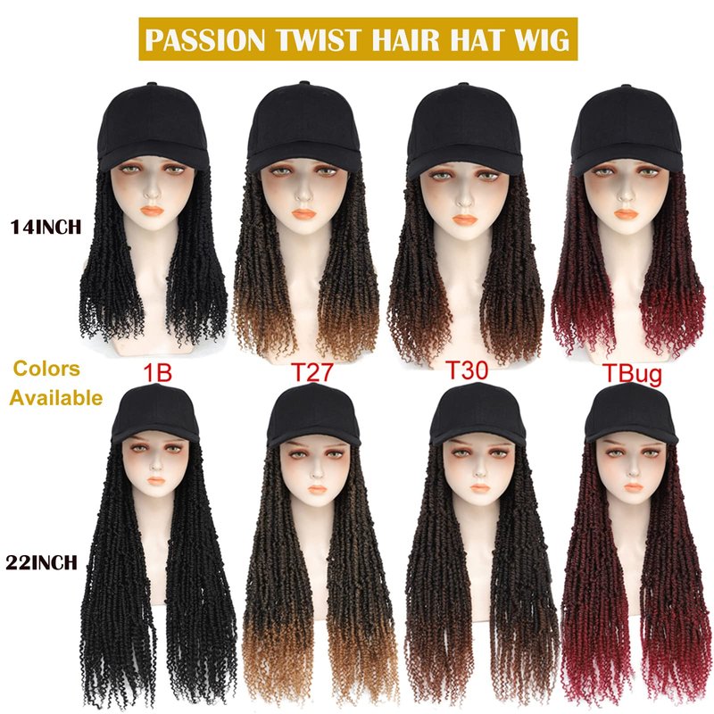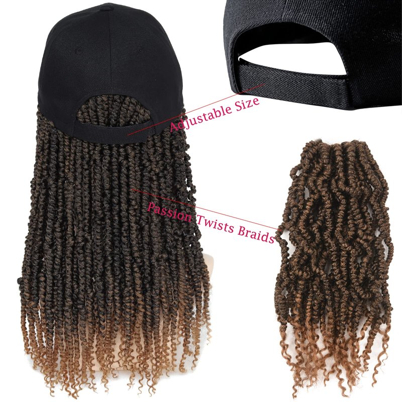 - 1. Specification and Material: Baseball Hat with passion twist hair is made of 14inch high quality Pre-twisted bomb twists synthetic fiber and Cotton Baseball Cap. The cap is breathable. The braids is sewed well in the hat by professional workers. The hair is super soft.