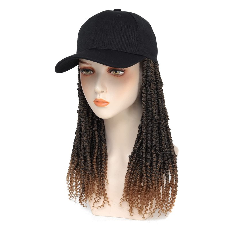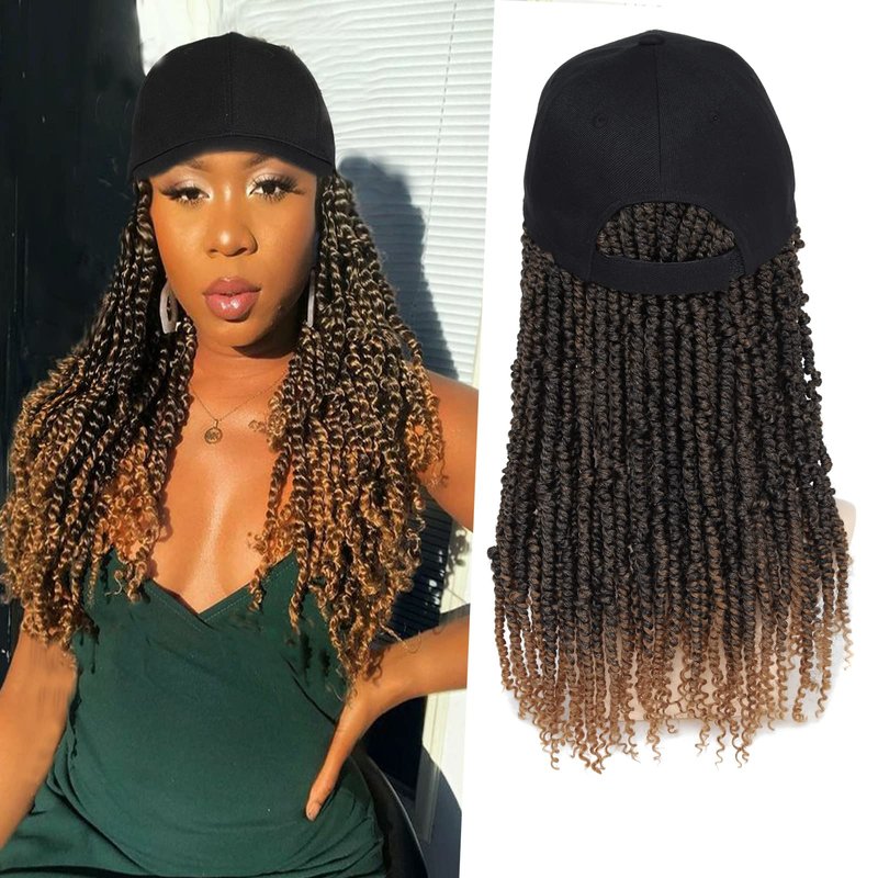 AliRobam Hat Wig Short Baseball Cap Wig with Pre-Twisted Ombre Brown Passion Twist Hair Extensions Synthetic Curly Ends Wig Hat Adjustable Black Baseball Hat Wig for Black Women(14inch, T27)
