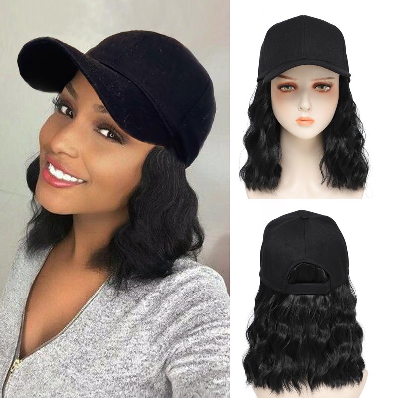AliRobam Hat with Natural Wave hair Extensions attached for woman Baseball cap wig Short Bob Hairstyle Adjustable Wig (Black)