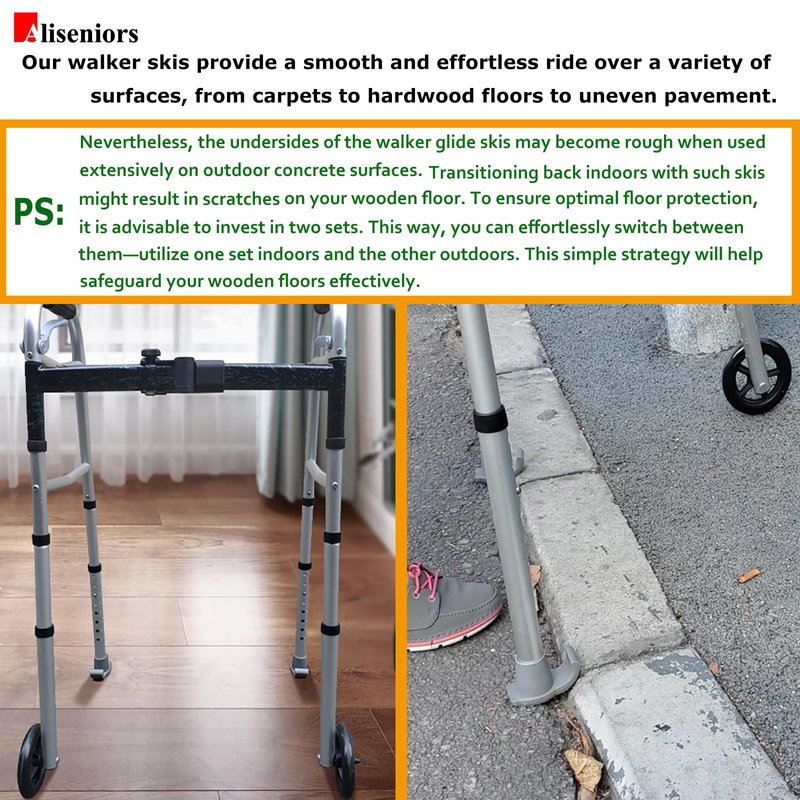 Aliseniors Walker Skis Glides - the must-have accessory for anyone who uses a walker or rollator. Our durable and lightweight walker sliders are designed to provide a smooth and effortless ride over a variety of surfaces, from carpets to hardwood floors to uneven pavement. Whether you're an older adult, an individual with mobility issues, or recovering from an injury, disabled and handicaps, the ski glides for walkers can make a huge difference in your daily life.