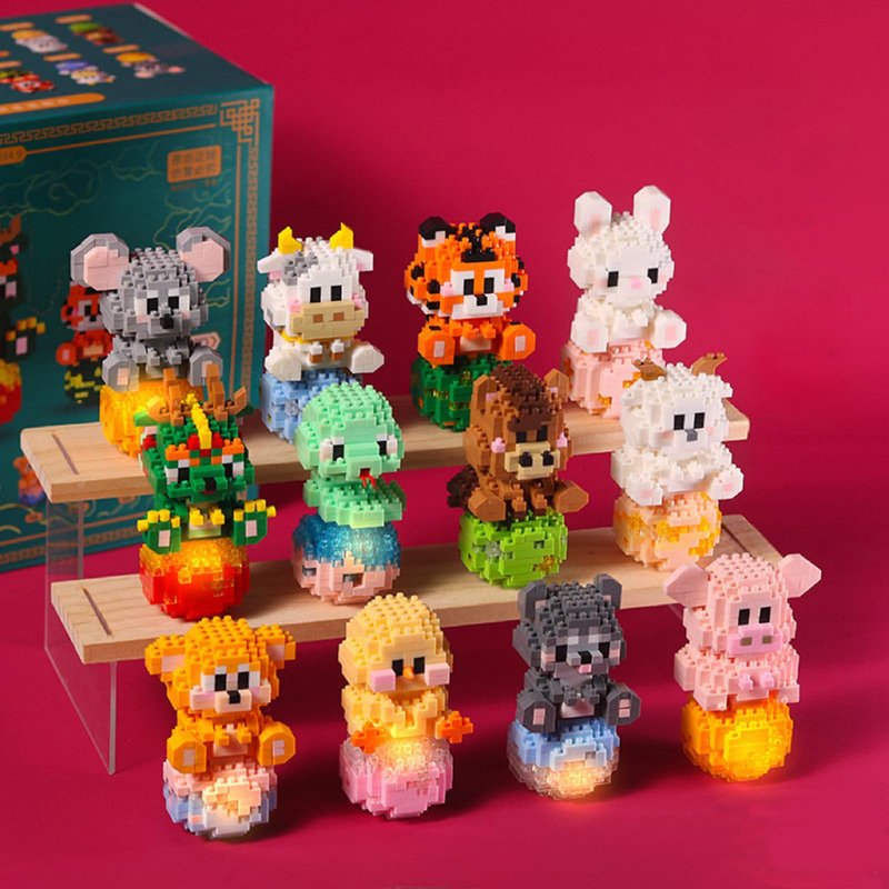 - 12 Mini Animals Building Blocks Set - 12 animals mini blocks set, including mouse, cow, tiger, rabbit, dragon, snake, horse, sheep, monkey, rooster, dog, pig.