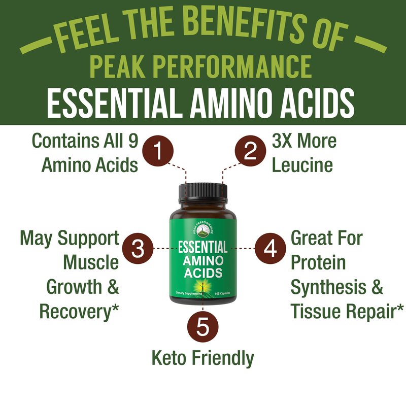 - Don’t Be Fooled By Low Dose Imitations! Many amino acid supplements contain low amounts of aminos especially leucine which is critical for muscle growth. With Peak Performance All 9 Essential Amino Acids you get all the Branched Chain Aminos plus more! With up to 3x more leucine per capsule for optimal muscle recovery and growth.