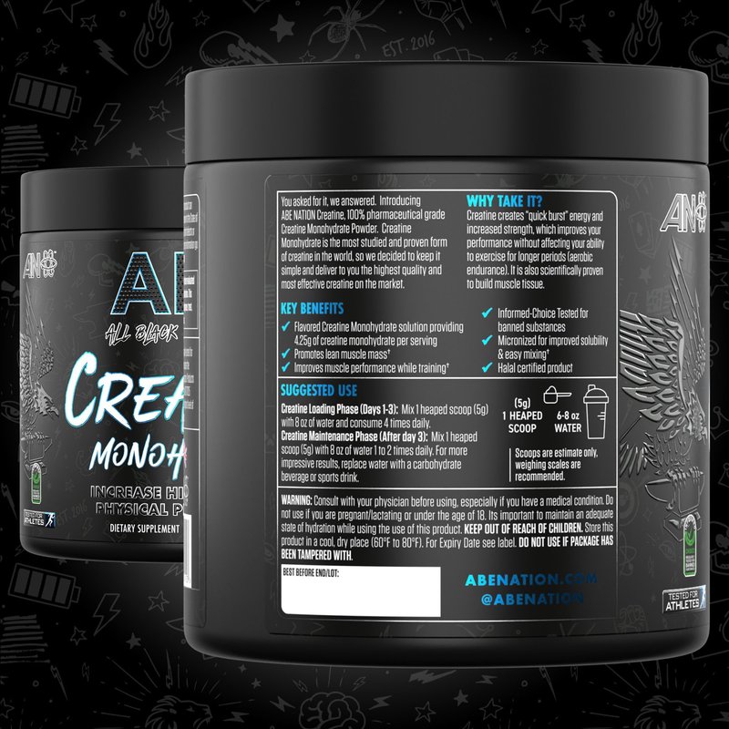Creatine If you are looking to improve your physical performance, ABE Creatine Monohydrate Powder is the perfect way to boost your workout. Thanks to the combination of our team of passionate sports nutrition enthusiasts and our state of the art manufacturing facility, we have created a Creatine Monohydrate formula that is easily absorbed. You can use it to help facilitate increased performance in prolonged physical activity or short successive bursts of high-intensity exercise. Using Creatine Monohydrate Micronised powder allows you to make the most of your energy during a workout. The Creatine amino acids work to break down food to take the rich protein content and convert it into energy. Creatine also promotes good muscle nutrition and extends your stamina for a better workout. Easy to mix We have made sure preparing our Creatine Monohydrate powder is as quick and easy as possible, so you can make it as you are leaving for the gym. Micronised powder mixes easily with water because of the fineness of the powder. All you need to do is mix 1 heaped scoop with 8 oz of water. Shake the mixture until the powder has mixed into the water and it is ready to drink. Informed Choice This product is regularly tested for banned substances under the Informed-Choice program. Products undergo rigorous testing at an ISO 17025 accredited lab to provide the highest level of assurance for tested athletes.
