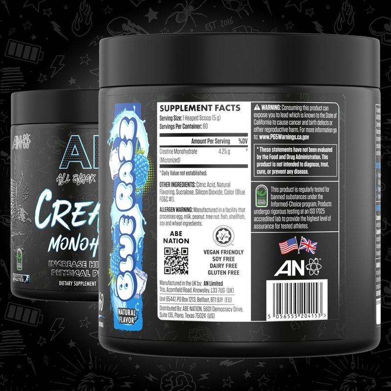 All Black Everything Creatine Monhydrate | 60 Servings | Blue Razz | Micronized Amino Acid Powder | Support Muscles | Cellular Energy | Cognitive Function | Gluten-Free and Keto Friendly