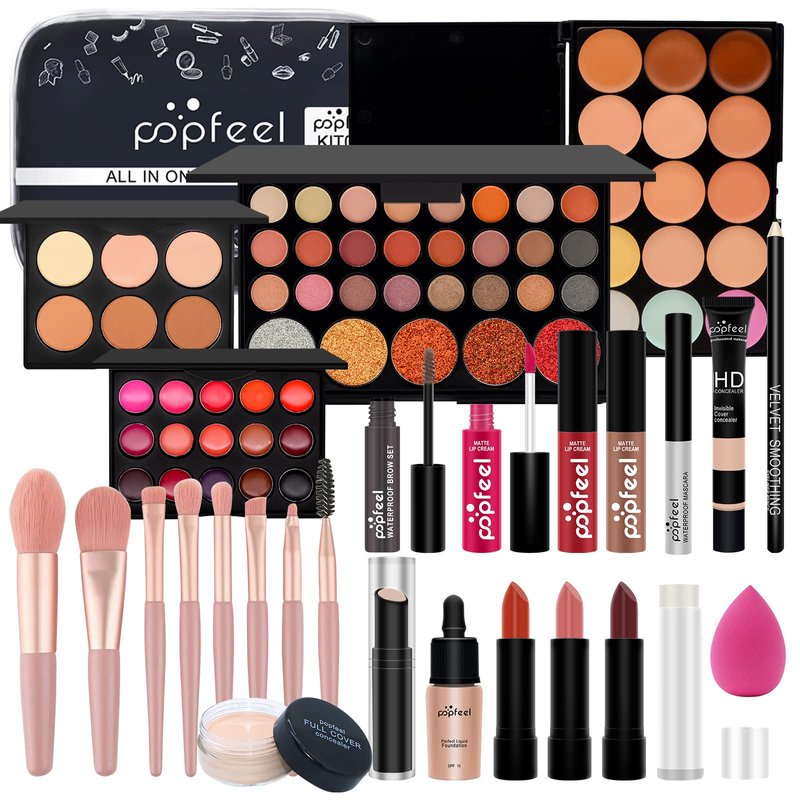 - 【All In One Makeup Set】A perfect starter makeup kit that includes eyeshadow palette, Pressed powder,lipstick palette, lipgloss, lipstick ,concealer cream, makeup brush, concealer palette, eyebrow cream, concealer stick,HD concealer, eyebrow cream, eyeliner, lip balm, mascara, foundation, powder puff, travel bag. All women's essentials in one elegant box and a great gift for any occasion
