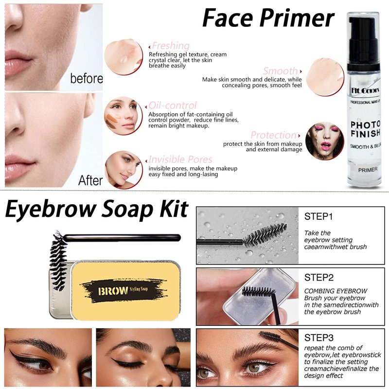 - All In One Makeup Kit For Girls --- The beginner makeup gift set including 12 Colors Eyeshadow Palette, Nude & Buff Beige Foundation, Face Primer, 3Pcs Liquid Lipsticks, Contour Stick, Eyebrow Soap, Winged Eyeliner Stamp, Mascara, Makeup Brush, 2Pcs Makeup Sponge. The face make up set is perfect for achieving a full-face flawless look.