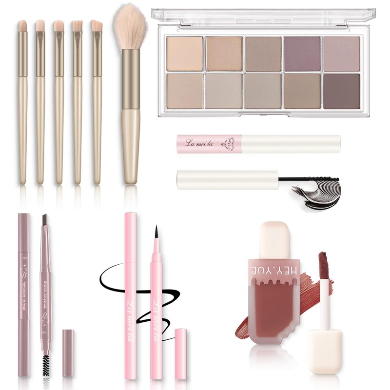 - šćWhat's in the Makeup Set?ć1 x 10 colors eyeshadow palette, 1 x waterproof and smudge-shield mascara, 1 x waterproof and smooth liquid eyeliner, 1 x brown eyebrow pencil, 1 x 6 pcs soft makeup brush set, 1 x lip gloss. Our eyeshadow palette's expertly curated shades are perfect for shading, highlighting, and defining eyes, brows, and the contours of the face.