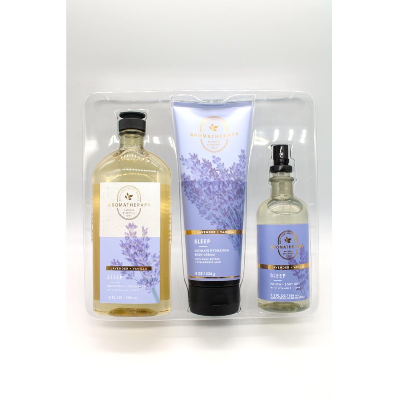 Gift Set: "All is Calm" / Fragrance Name: Lavender & Vanilla / Fragrance Notes: Lavender & Vanilla / Included in Set: Pillow + Body Mist (5.3 fl oz / 156 mL), Ultimate Hydration Body Cream (8 oz / 226 g), Body Wash + Foam Bath (10 fl oz / 295 mL) / Made without Parabens or Artificial Dyes / Not Tested on Animals & Vegan / Dermatologist Tested