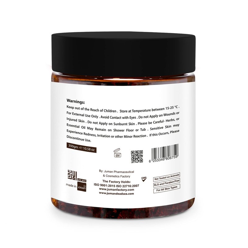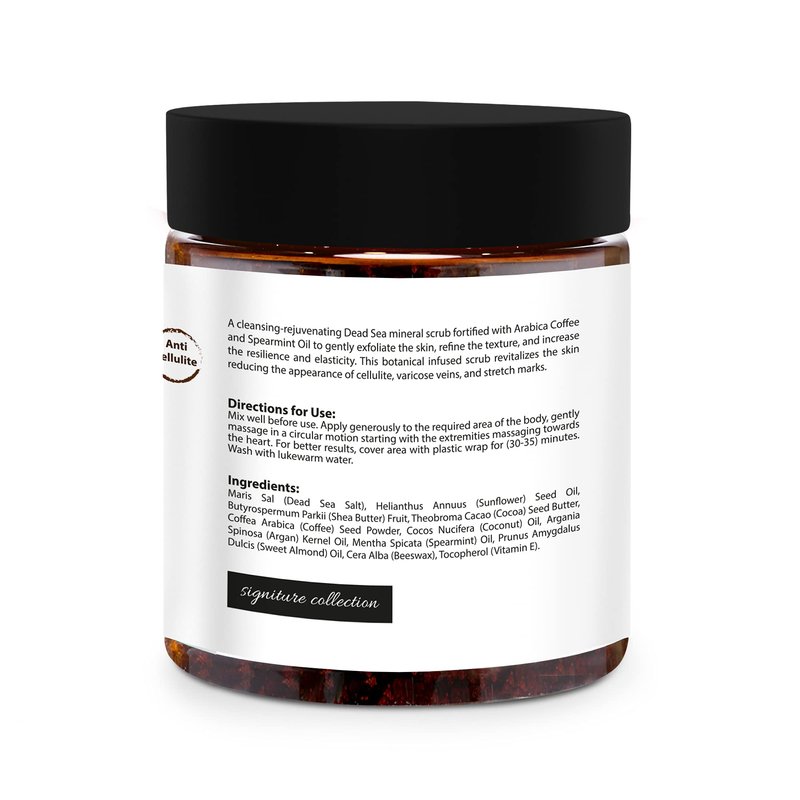 PRODUCT DESCRIPTION: A cleansing-rejuvenating Dead Sea mineral scrub fortified with Arabica Coffee and Spearmint Oil to gently exfoliate the skin, refine the texture, and increase the resilience and elasticity. This botanical infused scrub revitalizes the skin reducing the appearance of cellulite, varicose veins, and stretch marks. INGREDIENTS: Dead Sea Salt, Shea Butter Fruit, Coffee Seed Powder, Coconu Oil, Argan Kernel Oil, Spearmint Oil, Sweet Almond Oil, Vitamin E. Dead Sea Salt: Magnesium-rich organic salts enhance skin hydration and reduce inflammation in dry skin. Shea Butter: is an excellent natural skin moisturizer for face and body, it reduces wrinkles and fights signs of aging, and restores the skin’s elasticity. Coffee Seed Powder: contains a high concentration of essential fatty acids, and vitamin E making it a potent antioxidant that can offer protection against skin damage. Coconut Oil: works on reducing inflammation, keeping skin moisturized, and helping heal wounds. It also possesses properties that can help treat acne and protect the skin from aging. Argan Kernel Oil: is an oil rich in essential fatty acids, it nourishes skin, protects elasticity, and reduces the appearance of fine lines and wrinkles. Spearmint Leaf Oil: reduces the appearance of wrinkles and skin imperfections, such as discoloration. It is believed to help reveal a new layer of skin, thus increasing the skin’s resilience and elasticity. Sweet Almond Oil: a skin-friendly light oil to help your skin look smooth, soft, and free of fine lines. Vitamin E: helps in reducing UV and sun damage to the skin. DIRECTIONS FOR USE: well before use. Apply generously to the required area of the body and massage it gently in a circular motion. please leave the scrub on your skin for a few minutes and rinse off with lukewarm water. It has a recommended use of (1-2) times a week for sensitive skin.