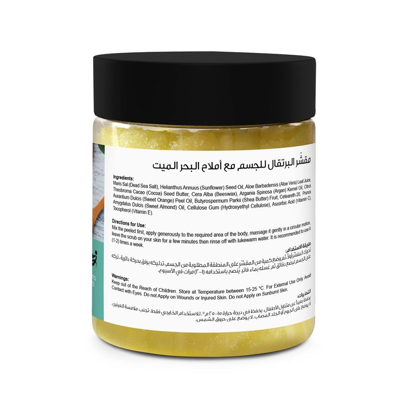 PRODUCT DESCRIPTION: Infused with wonderful nourishing ingredients such as Dead Sea Salt, Cacao Butter, and Aloe Vera Oil, Juman’s Pure Sweet Orange Body Scrub washes away dead skin cells and excess oil as it refreshes, revitalizes and softens the skin restoring it to its natural glow. INGREDIENTS: Dead Sea Salt, Sunflower Seed Oil, Aloe Vera Leaf Oil, Cocoa Seed Butter, Argan Kernel Oil, Sweet Orange Peel Oil, Shea Butter Fruit, Sweet Almond Oil, Vitamin C, Vitamin E. Dead Sea Salt: Magnesium-rich organic salts enhance skin hydration and reduce inflammation in dry skin. Aloe Vera Leaf Oil: healing properties proven to be effective in treating sunburns, and reducing scar visibility. It also works as a great moisturizing agent. Cocoa Seed Butter: helps to improve and repair the skin from sun damage and aging, it also soothes redness and blemishes that causes inflammation of the skin. Argan Kernel Oil: is an oil rich in essential fatty acids, it nourishes skin, protects elasticity, and reduces the appearance of fine lines and wrinkles. Sweet Orange Peel Oil: is beneficial for maintaining the health, appearance, and texture of skin by improving clarity, radiance, and smoothness. Excellent natural component used primarily for the treatment of acne. Shea Butter: is an excellent natural skin moisturizer for face and body, works well to restores the skin’s natural elasticity. DIRECTIONS FOR USE: Mix well before use. Apply generously to the required area of the body and massage it gently in a circular motion. please leave the scrub on your skin for a few minutes and rinse off with lukewarm water. It has a recommended use of (1-2) times a week for sensitive skin.