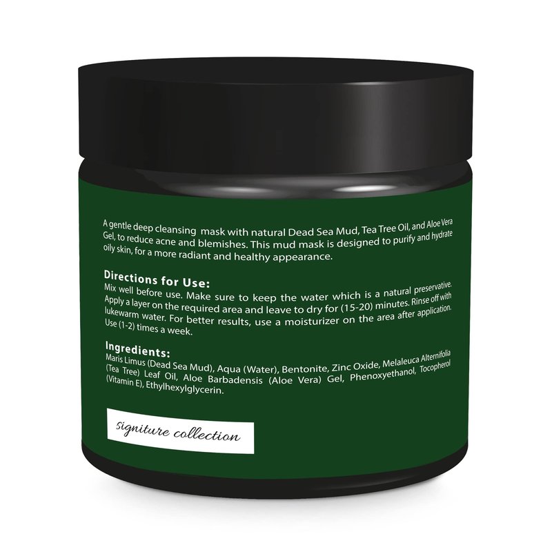 PRODUCT DESCRIPTION: A gentle deep cleansing facial mask with natural Dead Sea Mud, Tea Tree Oil, and Aloe Vera Gel, to reduce acne and blemishes. This mud mask is designed to heal and hydrate oily skin, for a more radiant and healthy appearance. INGREDIENTS: Dead Sea Mud, Tea Tree Leaf Oil, Aloe Vera Gel, Vitamin E. Dead Sea Mud: helps restore moisture to the skin, relieving dryness and irritation. It helps to Reduce the appearance of fine lines and the improvement of pores. Tea Tree Leaf Oil: Helps in the treatment of acne by calming redness, swelling, and inflammation. It may even help to prevent and reduce acne scars, leaving you with smooth, clearer healthy looking skin. Aloe Vera Gel: a natural source of treatment for a variety of skin ailments such as eczema, acne, and skin abrasions etc., It also has strong skin moisturizing properties that will leave your skin supple and refreshed. Vitamin E: helps protect the skin from UV damage, and has moisturizing effects to reduce inflammation of the skin for a smoother finish. DIRECTIONS FOR USE: Mix well before use. Make sure to keep the water which is a natural preservative ( the top layer of water located in container). Apply a layer on the face and leave to dry for (15-20) minutes. Rinse off with lukewarm water. For better results, use a moisturizer on the area after application. Has a recommended use of (1-2) times a week.