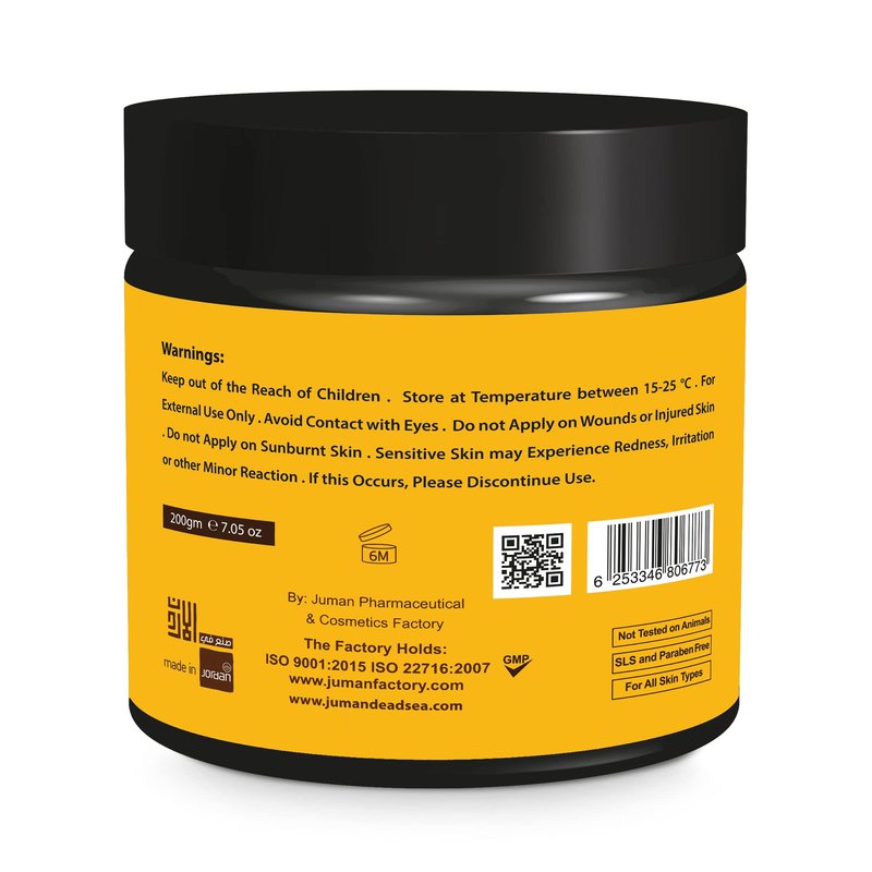 PRODUCT DESCRIPTION: All Natural Juman Turmeric Chamomile facial Dead Sea Mud Mask- 7.76 oz. A creamy combination of Dead Sea Mud and natural herbs and extracts to rejuvenate your skin. This facial mud mask is powered by Turmeric to deliver antioxidants and nutrients to detox and minimize pores, soothe dry skin, protect and helps reduce sun damage, and reduce dark circles. INGREDIENTS: Dead Sea Mud, Turmeric Root Powder, Chamomile Oil, Avocado Oil, Vitamin E. Dead Sea Mud: is used to cleanse and remove excess oils and skin impurities from the skin. Ideal for oily skin as well as treating acne and most skin disorders. Turmeric: has properties that help in reducing acne. It also soothes dry skin, protects against sun damage and aging, and reduces dark circles. Chamomile Oil: helps relieve acne. Avocado Oil: is high in fat and vitamins A and C, it helps to nourish, moisturize, and provide antioxidant protection for the skin. Vitamin E: this fat-soluble vitamin can be absorbed through the skin, it is a beneficial antioxidant that helps in reducing UV and sun damage to the skin. DIRECTIONS FOR USE: Mix well before use. Make sure to keep the water which is a natural preservative. Apply a layer on the face and leave to dry for (15-20) minutes. Rinse off with lukewarm water. For better results, use a moisturizer on the area after application. Use (1-2) times a week.
