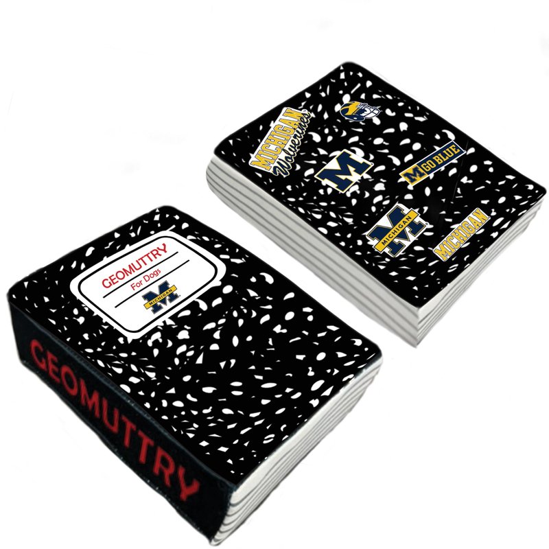 Michigan "Geomuttry" dog toy! In a traditional black & white composition notebook design, this fun & unique toy is sure to be one of your proud pup's favorites. With logo on the front & logo decals look printed on back, it has a fabric covering with 2" foam insert and 2 squeakers. Measures approximately 7" x 5". Officially licensed Collegiate product. MADE IN THE USA! Nicely made toy... though not ideal for those that are big chewers, rather a play toy/buddy for your dog.