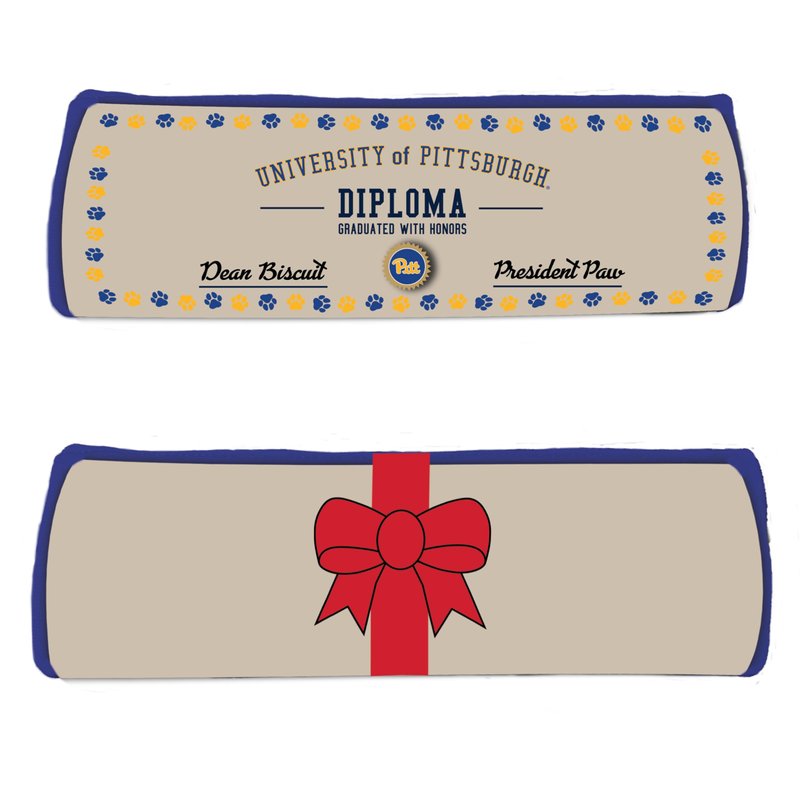 Pittsburgh "Diploma - Graduated With Honors" dog toy with 2 squeakers! In a traditional diploma design, this fun & unique toy is sure to be one of your proud pup's favorites. Featuring printed team logo/colors on the front & bow on back, it's tough spacer fabric is rolled in paper diploma style... which provides for a pocket-like interior where you can hide treats. Measures approximately 9" x 3.5". Officially licensed Collegiate product. MADE IN THE USA!