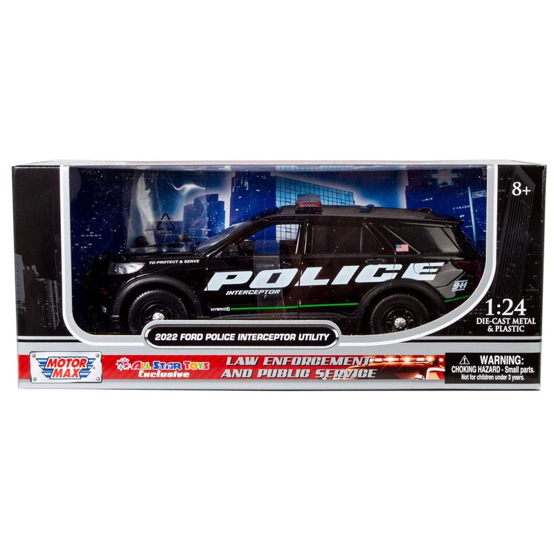 Brand new in box 1:24 scale 2022 Ford Explorer Police Interceptor replica with realistic police decals! A great gift for people who are fans of law enforcement vehicles. Openable front doors, true to scale with amazing interior details! Exclusively brought to you by All Star Toys, this police car delivers an exciting experience. Create thrilling scenarios with this model that depict real life in a fun and imaginative way.