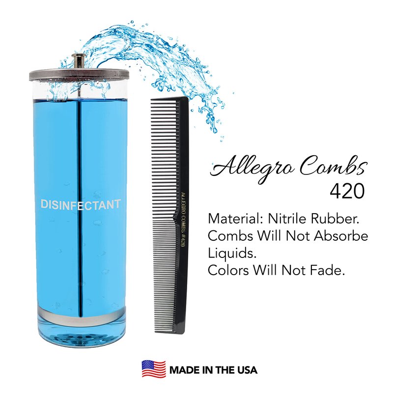 - DISINFECTABLE COMBS WILL NOT ABSORBE AND COLOR WILL NOT FADE IN BARBICIDE - These hair cutting combs model 420 from Allegro Combs will not absorb sterilizing solutions, perms, conditioners, shampoos, oil, water, etc. These combs can be used for wet and dry hair cuts and in many hair styling situations. Colors in comb will NOT fade in disinfectants and other liquids.