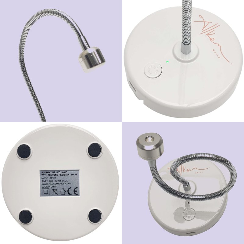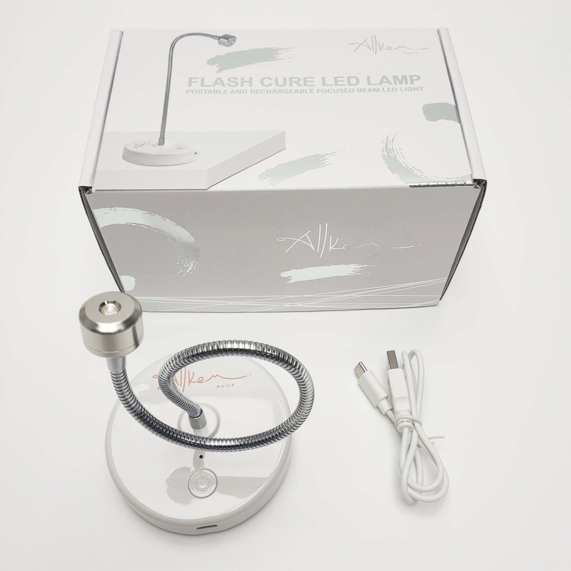 ALLKEM Nails Flash Cure hands-free portable UV LED nail lamp is designed for quick and convenient gel nail applications. This compact, wireless uv led lamp features a gooseneck design, a flat-weight base, and a USB charging cord, allowing it to be used hands-free on any flat surface. The nail led light provides a FLASH cure in 10-15 seconds but requires a full-size lamp based on gel polish specifications for complete curing. Flash Cure uv light for gel nails' flexible design allows the lamp to be adjusted 360° to achieve the proper curing angle. This gel light for nails is hands-free, lightweight, and ideal for various applications including gel manicures, pedicures, and applying art stones. It's rechargeable and cordless, making it convenient for travel with a long-lasting battery and a USB charging cord included. The uv lamp gel nail polish is available in silver and gold.