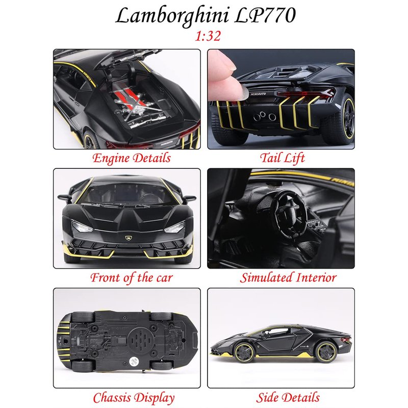 - Black lambo LP770 car model, 1/32 scale. Length 15.5cm, width 6cm, height 3.5cm, weight 260g.