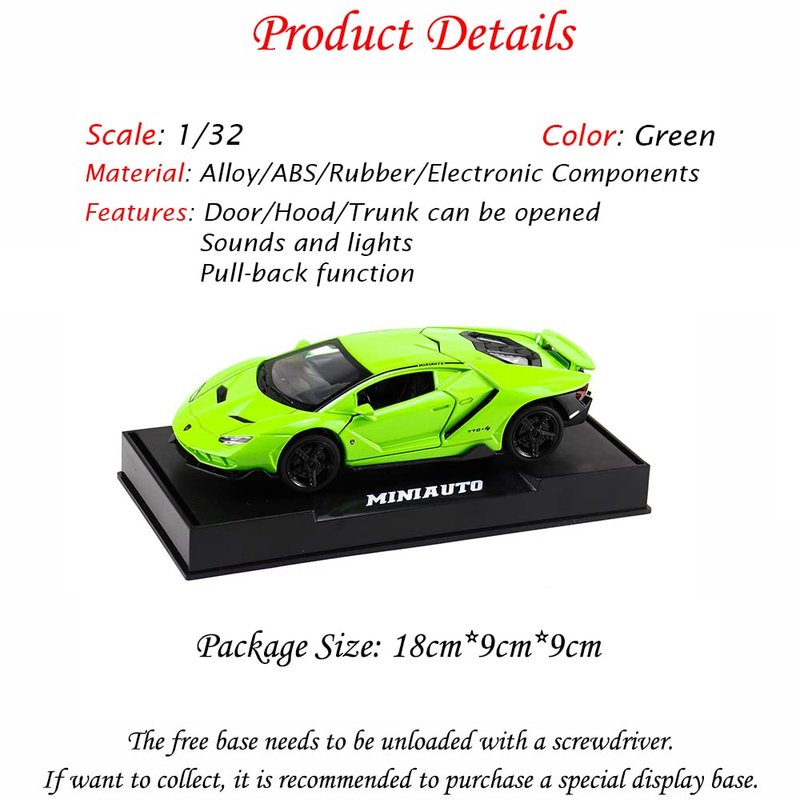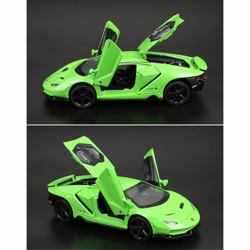 - Green Lambo LP770 car model, 1/32 scale. Length 15.5cm, width 6cm, height 3.5cm, weight 260g.