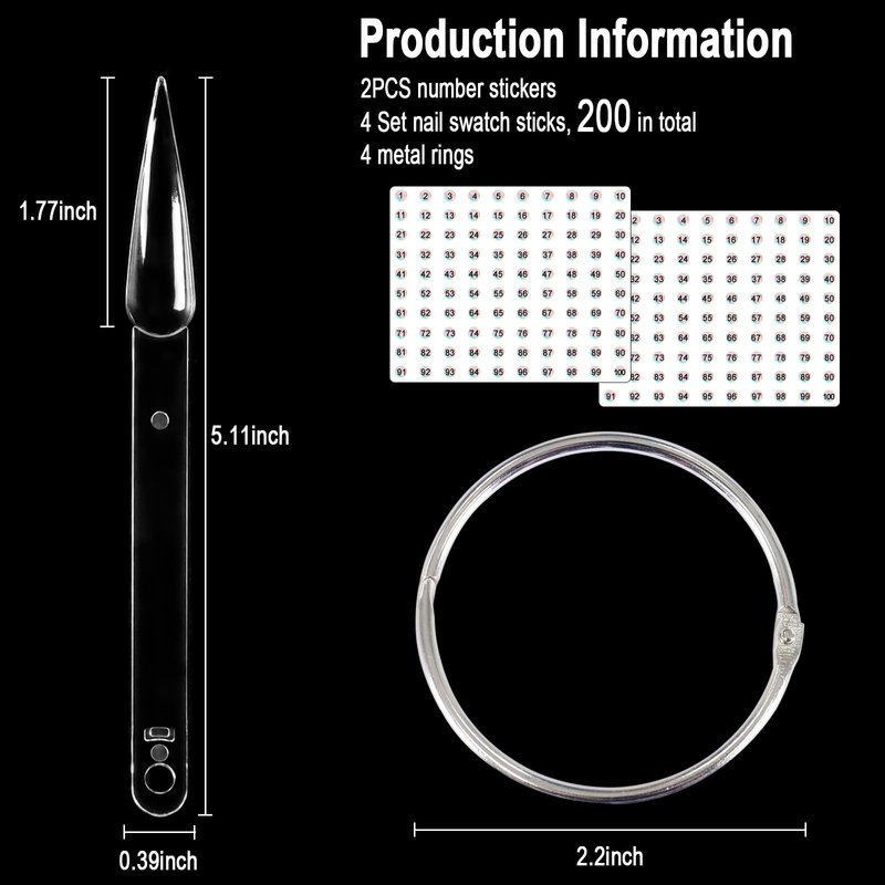 - Quantity: You will get 200pcs of nail polish sample sticks, 50pcs per set, and each set of nail swatch has a metal nail rings. In addition, there are 2 copies of holographic numbered stickers (Numbers 1-100), which you can paste on the nail sample sticks and find the nail polish colors quickly.
