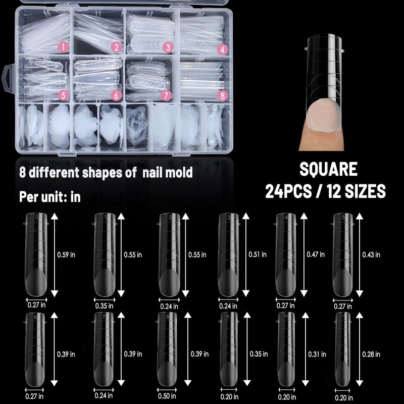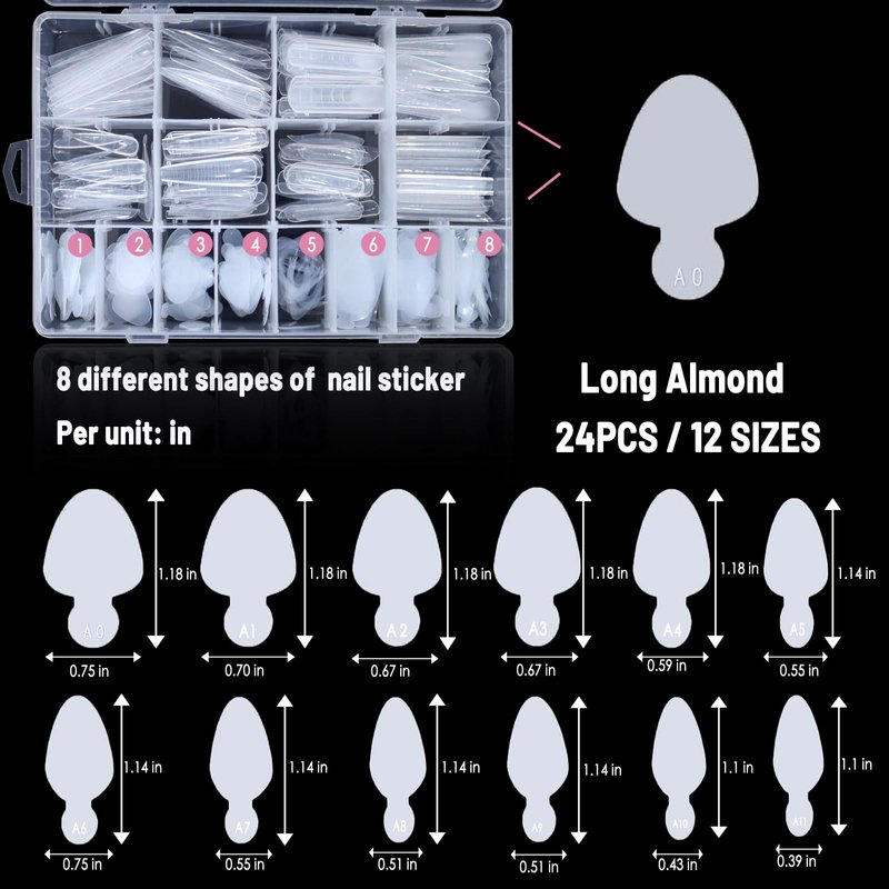 • Nail Dual Form Kit: Our nail forms for builder gel come with 8 shapes of dual nail molds, 24 pieces per shape(12 sizes, 2 pieces per size), 8 shapes of silicone stickers, 24 pieces per shape (12 sizes, 2 pieces per size). Each stiletto clear nail forms or nail stickers is separated by a small grid, a total of 16 grids, so you can be easy to find the types of nail form you want. 384pieces included, so you'll have plenty of nail forms for poly gel to work with for all your nail art needs.