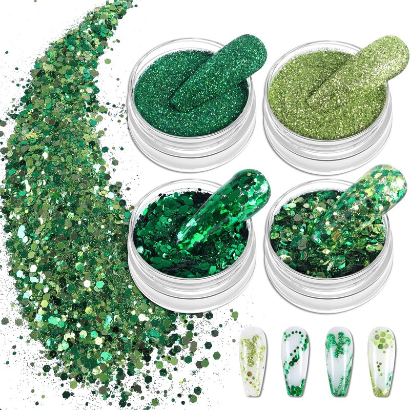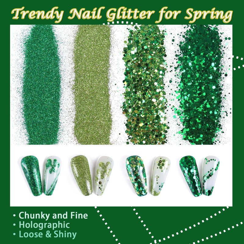 - 【Green Glitter Collections 】We collect the top trendiest green glitter from nail art supplies, fine glitter, and chunky glitter for manicures on spring. You can fully use them to create your DIY nails at home to disply spring outfits. The nail art kit comes with 4 jars of nail accessories with differernt shapes,sizes,and effect.