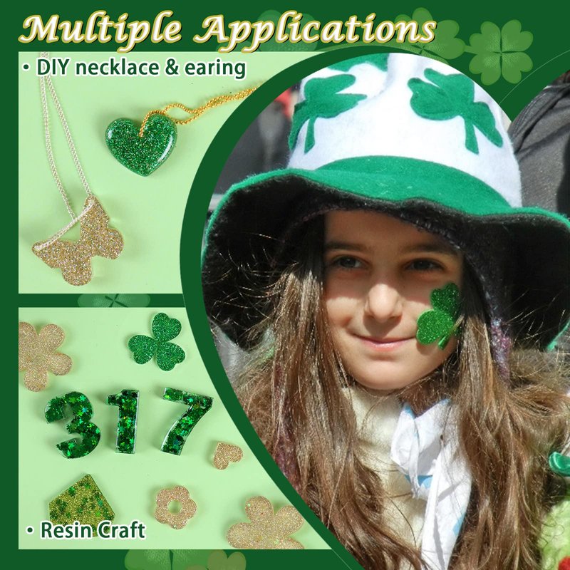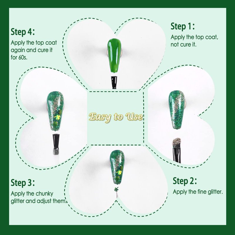 - 【Easy to Use】You can easily use the green nail charms to get salon-quality St. Patrick's Day nails. To make you easy to use the glitter for nails, we provide detailed steps and design some nails to give some inspiration. Use them and try more nail art with chrome nail powder, nail charms, flatback rhinestones, nail stickers, pearl for nails, nails jewels.