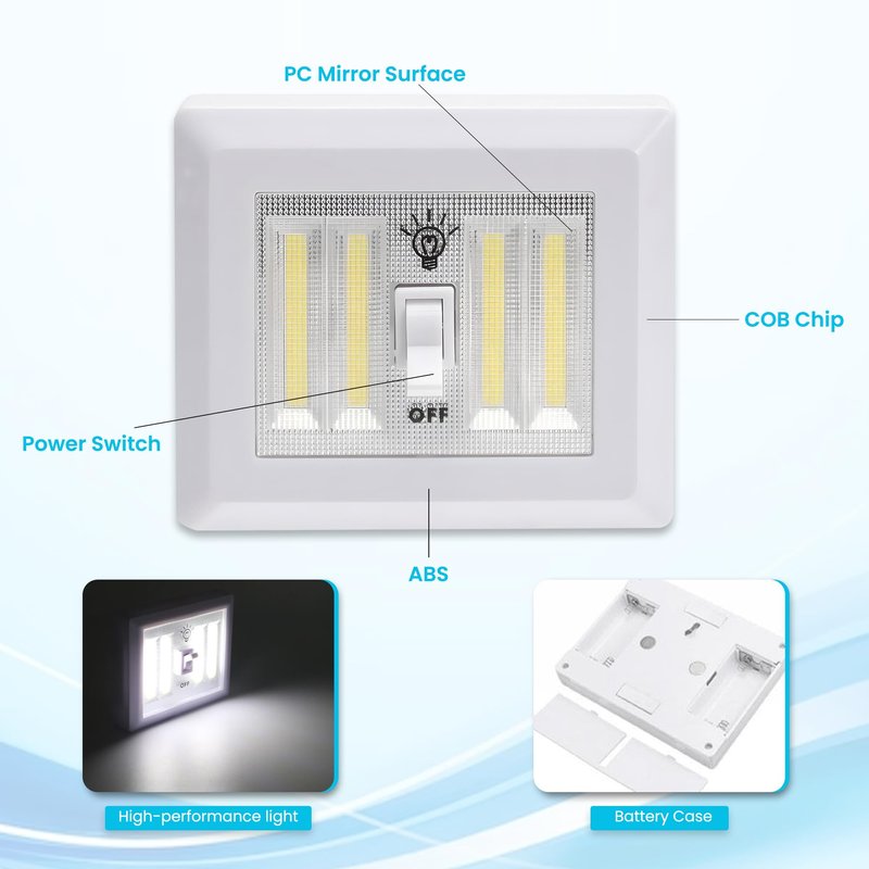 - 𝗦𝗨𝗣𝗘𝗥 𝗕𝗥𝗜𝗚𝗛𝗧 𝗜𝗟𝗟𝗨𝗠𝗜𝗡𝗔𝗧𝗜𝗢𝗡: Introducing the COB LED Switch Light, a cordless and easy-to-use light switch utilizing advanced COB LED technology. With a powerful 400 lumens output, it delivers super bright illumination, making it perfect for blackout situations and nighttime use. The brightness illumination feature ensures visibility in dark conditions, providing convenience and safety.