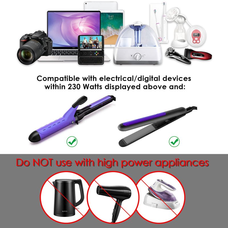 - ✈【NOTE】①The 230w power converter can charge product within 230 watts.②Please make sure the total wattage is less than 230w.③Don’t work with high watts appliance like electric hair drier,electric iron, electric kettle.