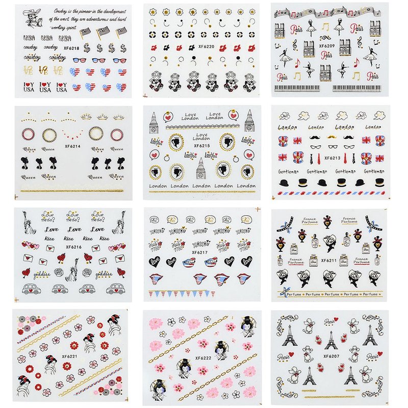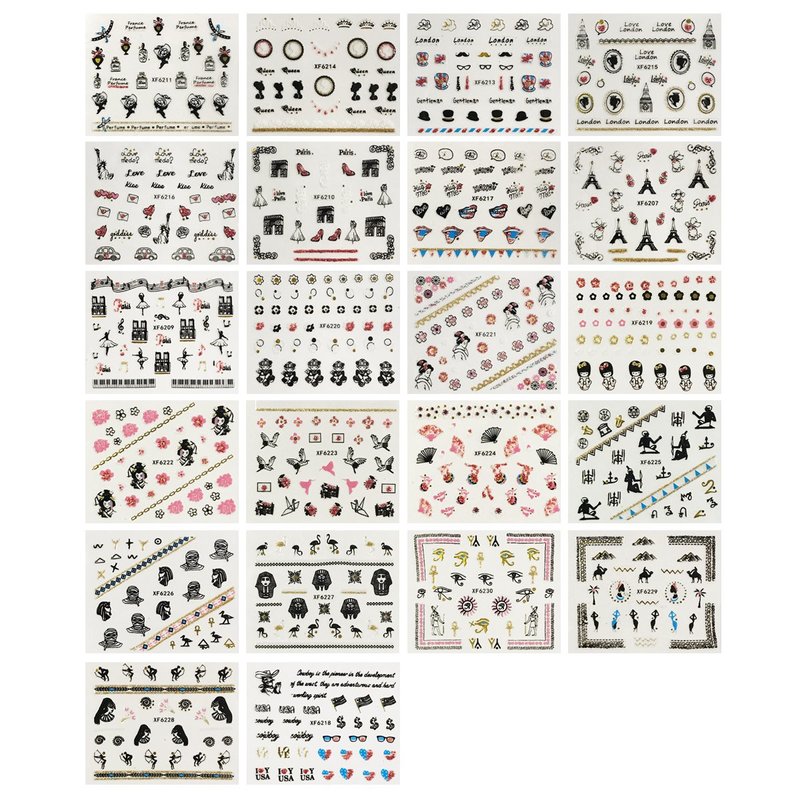 - SIZE: approx. 4.5" x 2.375" (each sheet); Each nail sticker varies in size; DESIGNS: From Egyptian hieroglyphics, cherry blossoms, patriotic flags to the Eiffel Tower & more!
