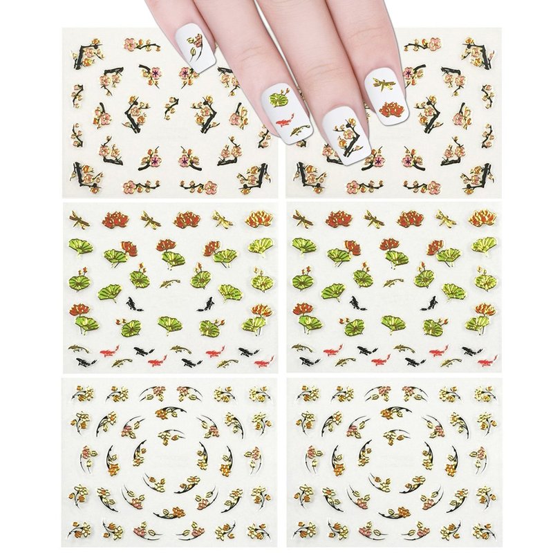 - INCLUDES: Cherry Blossom Nail Stickers (2 sheets), Lotus Leaves Nail Stickers (2 sheets) & Koi Fish Nail Stickers (2 sheets); 6 sheets of nail stickers total