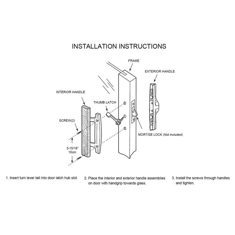 - 🔐【Easy to Install】Mortise style door handle fit door thickness from 1-1/2" to 1-3/4", 3-15/16" Screw Hole Spacing. 1- Insert latch, align inside and outside handles with door holes, insert screws, tighten and your done. Includes 6 screws with 3 different sizes: Large 2.25", Medium 2", Small 1.65".