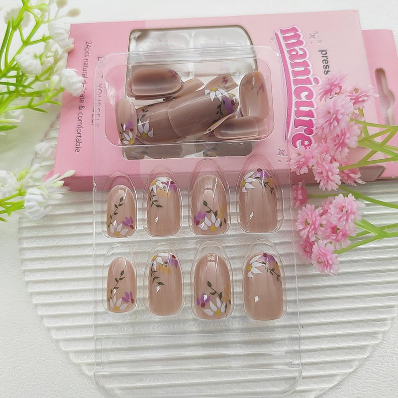 Almond Press on Nails Short Fake Nails with Floral Designs Cute Acrylic Nails Press ons Glossy Glue on Nails Nude Full Cover Artificial Stick on Nails for Women 24Pcs