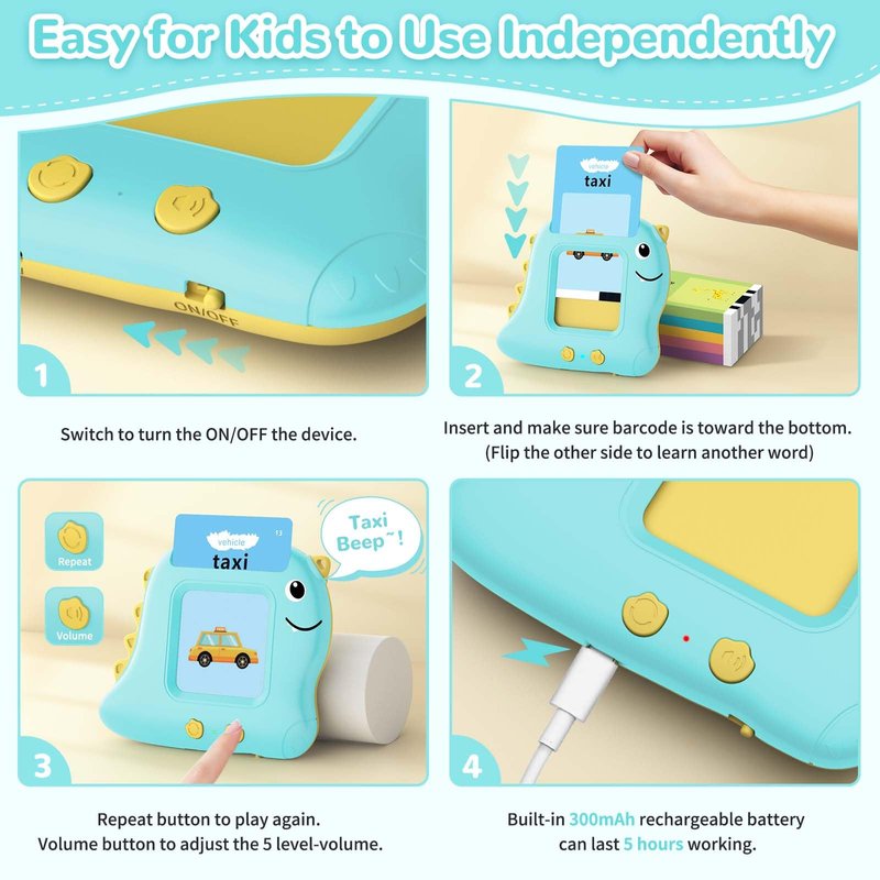 【Learning in a Montessori Way】255 double-sided cards containing 510 early development sight words. Let kids learn English with fun. Great educational toys for 2-6 year old at preschool age. 【Preschool Learning Activities】portable to put in a storage bag to use at outdoors like classrooms, daycares, kindergartens. Teachers and parents can teach little ones to imitate and talk. Some particular cards have a simulated sound. Surprise cards for you to discover. So it's great to play as a busy toy during travel, long car trips, plane, church, camping, zoo, etc. Fun travel essential toy for kids. 【Multi-Sensory Therapy Toy】the sound toy attracts little kids' attention, particularly beneficial for children with autism, non-verbal, visual disabilities, ADHD, and cerebral palsy. With the combination of colorful images and realistic audio sound, children will have an interest in recognizing and interacting with new concepts. Strengthens child-parent connections. 【Upgrade Technology】dual sensor barcode recognition, enhancing accuracy greatly. No worries images and pronunciation matching wrong. No worries inappropriate words. Good for little kids to use repeatedly. And we provide a hand wrist strap lanyard that makes it convenient for children to hold the pocket speech. Have fun anywhere. 【Ideal Gifts】this toddler communication learning toy set makes perfect gifts for various occasions including birthdays, Valentine's Day, Easter, back-to-school, Thanksgiving Halloween, and Christmas. Fun little stuffers to gift to children. Suitable for boys and girls aged 18 months, 2 3 4 5 6 years. The interactive language development can be used at home or in the classroom. 【Toddler-Friendly Design & Use】small size perfect for toddlers' small hands, easy to grasp and use. And our cards are thicker and more durable. Not easy to bend. The rechargeable battery can last at least 5 hours using. This cute dinosaur design is suitable for boys, girls, and dinosaur lovers kids.