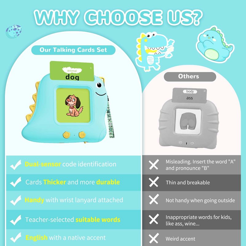 - Upgraded Tech & Content: our words and images were teacher-approved. Not like other brands including inappropriate words. And our cards are thicker and more durable for little kids to use. Not easy to damage and bend. Equipped with dual sensor barcode recognition, no worry sounds and cards do not match. Offer a wrist strap lanyard to attach, convenient for children to use outdoors, in the car, road trips and airplane. Great travel essentials busy toys for little ones.