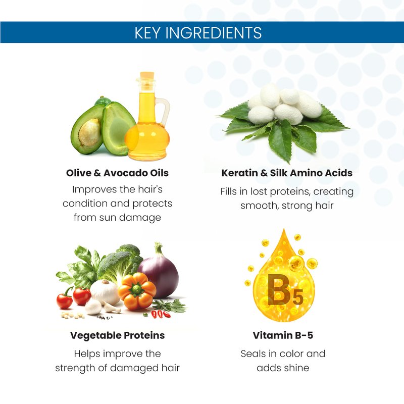 - Enriched with olive and avocado oils, hydrolyzed keratin and silk amino acids